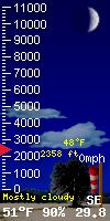 Hi 48 °F | Showers likely and possibly a thunderstorm. Mostly cloudy, with a high near 48. South wind around 16 mph, with gusts as high as 34 mph. Chance of precipitation is 70%. New rainfall amounts between a quarter and half of an inch possible. |